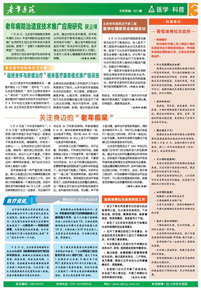 7月25日,北京老年医院院长陈峥申请的《2014年老年病防治适宜技术的推广应用研究》经北京市科学技术委员会批准,获得了“首都十大疾病科技成果推广”的立项。