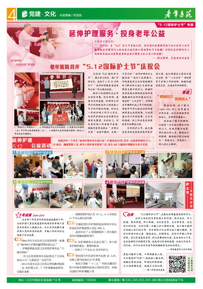 为庆祝“5.12国际护士节”,展示护士风采,推广护理文化,我院于5月12日举行了“延伸护理服务 投身老年公益”主题庆祝会。