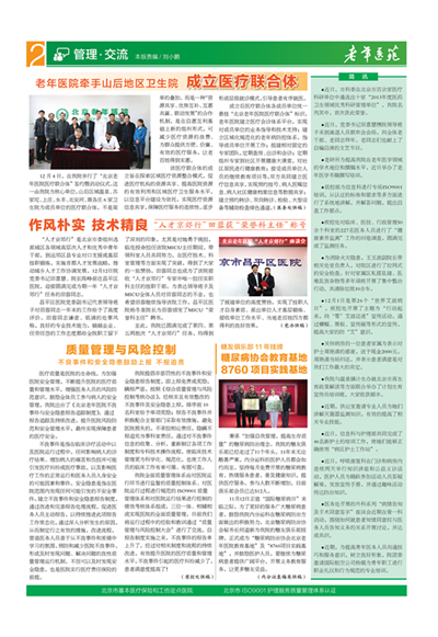 12月4日,在我院举行了“北京老年医院医疗联合体”签约暨启动仪式。这一由我院为核心单位,山后区域温泉、苏家坨、上庄、永丰、北安河、聂各庄6家卫生院为成员单位的医疗联合体,不是简单的叠加,而是一种“资源共享、优势互补、互惠共赢、联动发展”的合作机制,是在自愿互利基础上新的组织形式,可减少医疗资源的浪费、为群众提供方便、价廉、有效的医疗服务,让老百姓得到实惠。