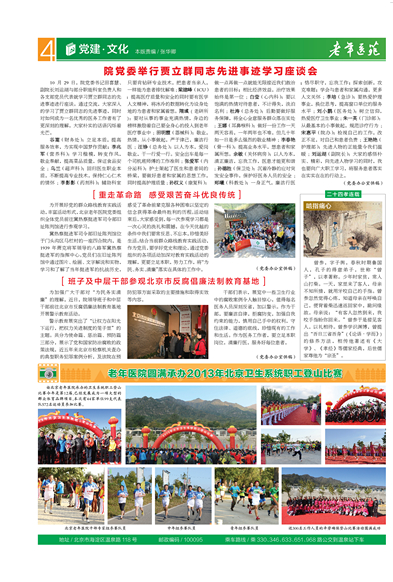 谷嵩(财务处):立足本质,提高服务效率,为实现中国梦作贡献;李兆军(营养科):学习楷模,转变作风,敬业奉献,提高菜品质量,保证食品安全;乌兰(超声科):回归医生职业本质,不断提高专业技术,保持仁心仁术的情怀;李影影(药剂科):辅助科室只要肯钻研专业技术,把患者当亲人,一样能为患者排忧解难;梁建峰(ICU):提高医疗质量和安全的同时要有医学人文精神,将冰冷的数据转化为服务患者的热情;隋彧(老研所):要对从事的事业充满热情,身边的榜样激励着自己要全身心的投入到老年医疗事业中;田明霞(器械科):敬业,热情,从小事做起,严于律己,廉洁行医;汪铮(总务处):以人为本,爱岗敬业,干一行爱一行。安全出车是每一个司机班师傅的工作准则;张爱军(内分泌科):护士架起了医生和患者间的桥梁,要做好患者和家属的思想工作,同时提高护理质量; 孙权义(康复科):做一点再做一点就能无限接近我们救治患者的目标;相比经济效益,治疗效果始终是第一位;白莹(心内科):要以饱满的热情对待患者,不计得失,淡泊名利;杜涛(总务处):后勤要做好服务保障,将全心全意服务群众落在实处;王娜(耳鼻喉科):做好一份工作一天两天容易,一年两年也不难,但几十年如一日是多么强烈的敬业精神;李春艳(骨一科):提高业务水平,想患者和家属所想。余敏(关怀病房):以人为本,清正廉洁,忘我工作,医患才能更和谐;孙德胜(保卫处):沉着冷静的应对突发安全事件,保护好医患安全;郑曦(科教处):一身正气,廉洁行医;恪尽职守,忘我工作;探索创新,攻克难题;学会与患者和家属沟通,更多人文关怀;李培(急诊):要热爱护理事业,换位思考,提高窗口单位的服务水平;刘小鹏(医务处):树立信仰,热爱医疗卫生事业;朱一英(门诊部):从最基本的小事做起,规范诊疗行为;宋惠平(院办):检视自己的工作,改正不足,对自己和患者负责;王艳艳(护理部):先进人物的正能量令我们温暖。
