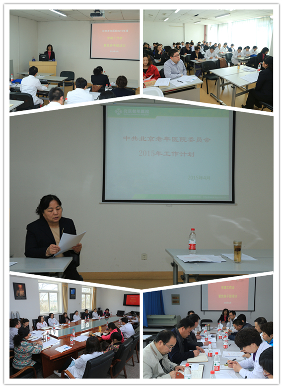 田喜慧书记传达了《中共北京市医管局委员会2015年党的建设工作要点》和《中共北京市医管局委员会2015年党风廉政建设和反腐败工作要点》,对照医管局的相关绩效指标,详细解读了《中共北京老年医院委员会2015年工作要点》,要求全院“紧紧围绕医院的中心任务,突出从严治党这条主线,充分利用医管局党建绩效考核这一平台,坚持问题导向,持续深入转变作风,提高领导干部政治意识,切实加强党性党风党纪教育,坚决反对和防止“七个有之”现象,进一步完善干部考评管理体系、人才遴选培育体系、党风廉政建设责任体系和医院文化建设体系,统筹推进思想建设、组织建设、作风建设、制度建设,全面提升党建的科学化、制度化、规范化水平”;各党支部要深入领会医管局和医院党委的工作要点,面对医院发展新常态下的学科和人才建设瓶颈、发展中的问题难题等,以爱院、爱岗的精神夯实基础工作,创新特色工作,兼顾当前与长远,在医院的发展建设中充分发挥支部党建的作用和优势,促成良好的习惯养成,为医院科学、稳健和全面发展提供坚强的政治保障。