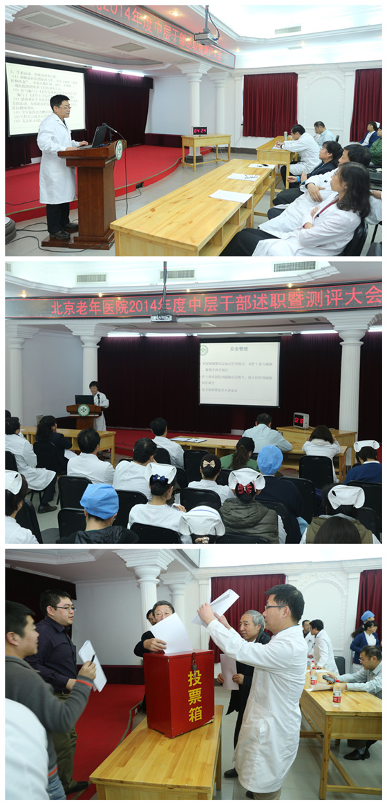 在12月29日、30日和31日下午,我院利用三个半天召开了中层干部述职及测评大会,院领导、各科室主任以及护士长近百人参加。会上,62名中层干部以PPT的形式分别从德、能、勤、绩、廉的角度,陈述一年来科室工作开展的基本情况,对科研、绩效、科室工作的亮点及创新点等进行了重点汇报,并提出了2015年的工作设想。大家的述职报告注重具体实例,既客观的展示了科室成绩,又敢于查找不足,提出改进措施。全部述职结束后,院领导、中层干部和护士长结合日常工作及述职情况对中层干部进行测评划票。集中测评和科室测评的统计结果将作为干部年度评价的重要参考,进而促使中层干部进一步发挥骨干作用,为来年医院的更大发展贡献力量。