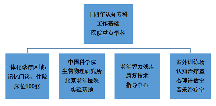 【学科发展】北京老年医院老年认知障碍诊疗中心成立于2003年,是专门从事各型痴呆及相关疾病的专业诊断、治疗、康复和临床研究的专业科室。2006年成为海淀区智能残疾康复技术指导中心,2009年与中国科学院生物物理研究所-脑与认知科学国家重点实验室进行合作,成为中国科学院生物物理研究所北京老年医院实验基地,2010年成为院级老年认知障碍重点专科,正在致力打造服务北京、面向全国,在老年认知障碍及其并发症的预防、诊断、治疗、康复、护理及基础研究方面有专长和特色的老年亚专科。