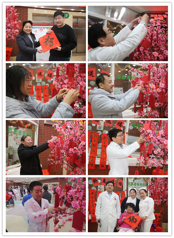 院领导们也赶来为患者及医务人员献上祝福,“送春联、送福字”,一张张由爱好书法的志愿者创作的对联和福字,寄托着对广大“医护患”的祝福,由院领导送到患者、家属、职工手中,借此拉开了“迎春接福”活动的序幕,来自消化科的一位老年患者,接到“祝福”之后,满怀欣喜,流下了激动的眼泪。“送福”现场一片和乐融融,笑语欢声阵阵,最后大家纷纷在许愿树下合影留念。