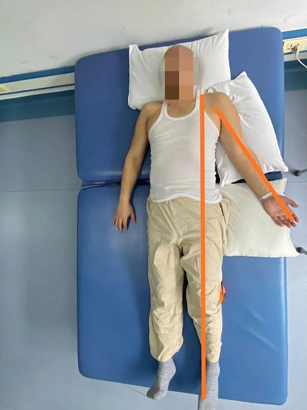 注意:由于长时间仰卧位会引发压疮的危险,并且会加重伸肌痉挛,所以这个动作只作为体位更换的一个过渡性卧位,不要长期保持这个姿势。