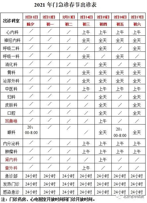 根据《国务院办公厅关于2021年部分节假日安排的通知》:2月11日至17日放假调休,共7天。2月7日(星期日)、2月20日(星期六)上班。为方便广大患者就诊,在春节假期开放部分科室门诊,请患者根据自己的就诊需求及专业科室开诊时间,前来就诊。