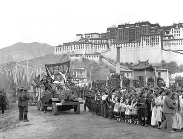 △从青藏公路开到拉萨布达拉宫前的汽车队,受到当地人民的夹道欢迎
