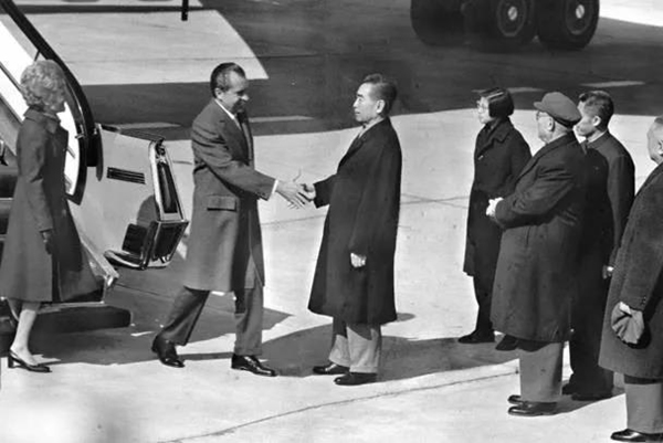 1972年2月21日上午11点30分,美国总统尼克松乘坐的“空军一号”飞机降落在北京机场。舱门开启,尼克松快步走下舷梯,向前来迎接的中国总理周恩来伸出右手。周恩来说,你的手是伸过世界最辽阔的海洋来和我握手。