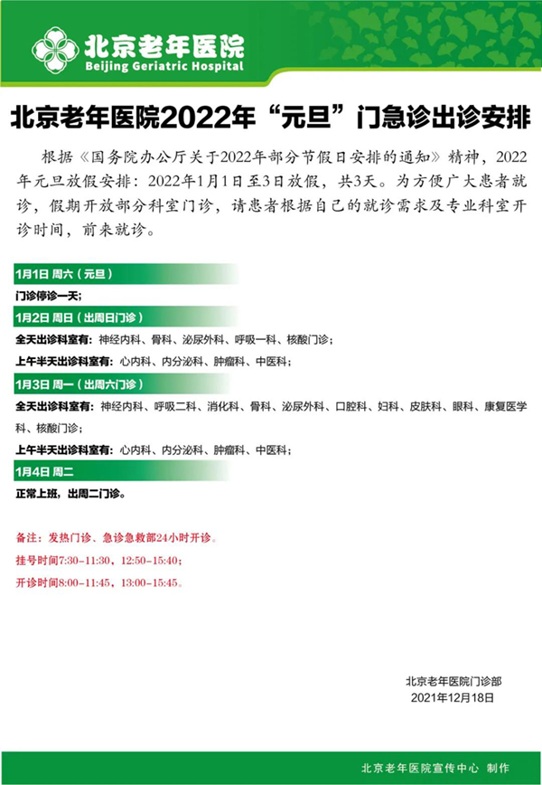 北京老年医院2022年元旦假期门诊安排