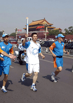时任北京奥组委副主席蒋效愚:历时两天的雅典奥运火炬在京传递活动,即将圆满结束。今晚,北京市委、市政府,北京奥组委,和中国奥委会,在火炬传递活动的终点颐和园举行庆祝晚会。现在,雅典火炬北京传递的最后一棒,火炬手、中国著名的运动员姚明已经跑进会场,让我们热烈欢迎!