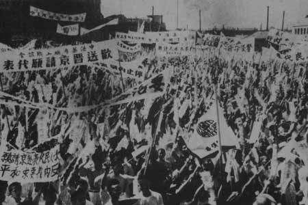 △社会各界群众打着标语、高喊口号,欢送上海人民和平请愿代表团
