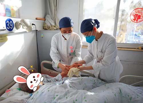 在呼吸内科病房、关怀科病房里,值班护士正在帮助不能自主下床活动的病人擦洗。这一暖心的动作,让无人陪伴的病人感受到了如家一般的温暖。