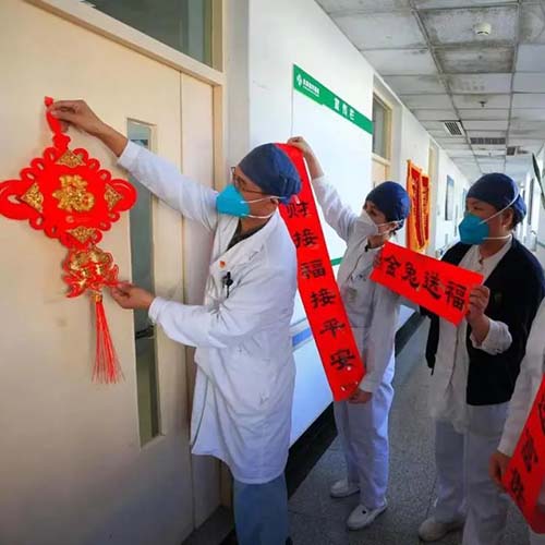 在骨科病房、泌尿外科病房,护士长正带领同事们一起给病区大门贴对联,给走廊、病房挂灯笼、拉花。“过年了,病区里还住着10多位老人。希望喜庆的年味儿能让他们心情舒畅,早日康复。”