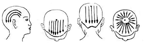 1 从头顶部百会穴向前额方向刮拭,每一个方向刮拭10-20次,依次逐渐向左侧方向移动,直到刮拭百会向哑门方向为止;然后再从头部前正中线开始,依次逐渐向右侧方向移动,每一方向刮拭10-20次,直到刮拭百会向哑门方向为止。简单来说,就是以百会为中心向周围放射刮拭。