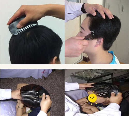 2 刮拭头部正中线,从前向后刮拭,采用先轻,后重,再轻的手法刮拭30次,然后依次向头部两侧移开并分别从前向后单方向刮拭。因类似梳头动作而得名梳头法。