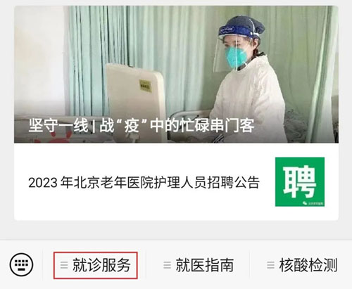 1.扫描二维码,关注北京老年医院公众号,点“就诊服务”、“预约挂号”: