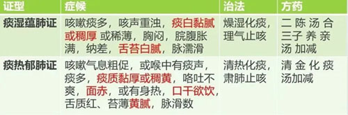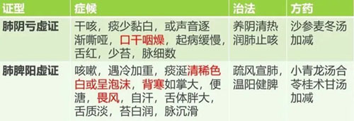 分证论治是根据咳嗽、痰液的性质,伴随症状及舌脉,判断是风寒袭肺证、风热犯肺证、痰热郁肺证等证型,从而给予相应的治法方药,详细辨证见下表:
