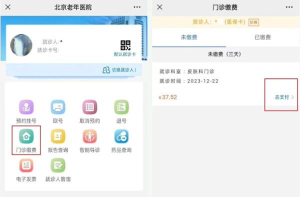 您可以通过“北京老年医院”公众号中的“门诊缴费”选项进行线上缴费,无需排队,北京医保患者诊疗费用实现医保实时结算。