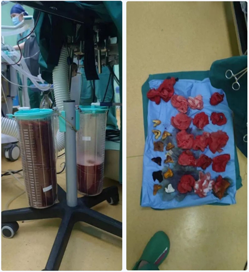 手术中,麻醉科权哲峰主任医师亲自指导麻醉,主刀医生伊诺主任医师精准定位出血点,迅速有效止血,并清除约4000ml的腹腔积血。