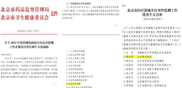 日前,北京市药监局和北京市卫健委发布《关于2023年度药械化妆品不良反应监测工作表现突出单位和个人的通报》,北京老年医院被评为2023年度“北京市医疗器械不良事件监测工作先进单位”,医工处维修组组长陈宏军同志荣获2023年度“北京市医疗器械不良事件监测工作优秀个人”称号。