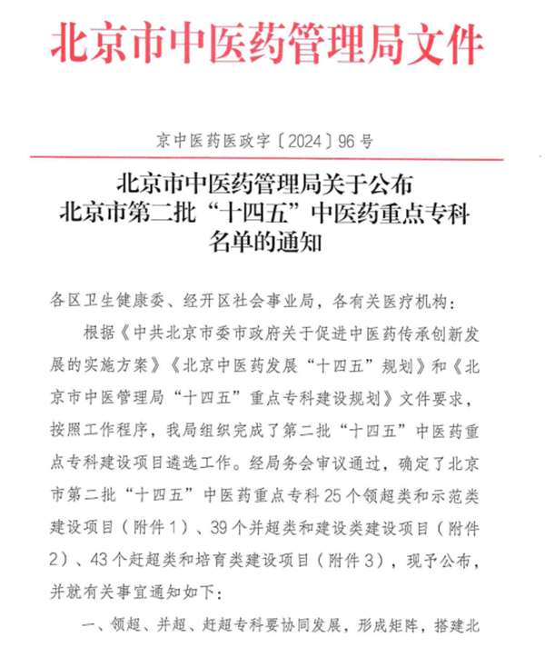 日前,北京市中医药管理局印发《北京市中医药管理局关于公布北京市第二批“十四五”中医药重点专科名单的通知》,遴选确定了25个领超类和示范类建设项目,39个并超类和建设类建设项目,43个赶超类和培育类建设项目。