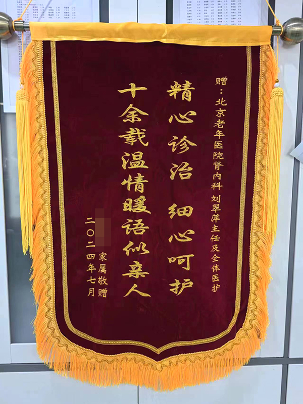 7月16日中午,北京老年医院肾病科刘翠萍医生在门诊诊室接待了一位女士,其母亲曾在我院接受了14年的血液透析治疗。在老人离世1个多月后,她专程来门诊送上了一面锦旗和一封信,锦旗上写着“精心诊治 细心呵护 十余载温情暖语似亲人”,表达了患者家属对肾内科医护人员的感激之情。