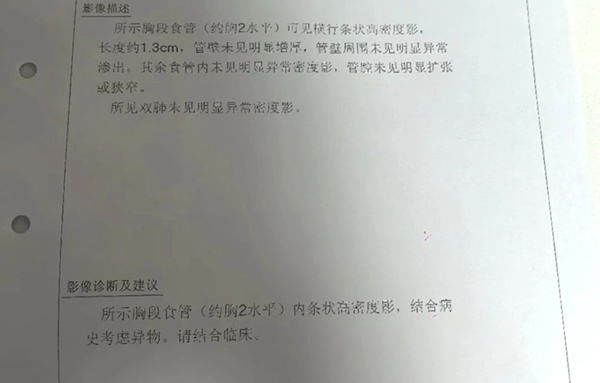外院CT结果显示,患者胸段食管(约胸2水平)内条状高密度影,结合病史考虑异物,且取出有难度,情况危急。