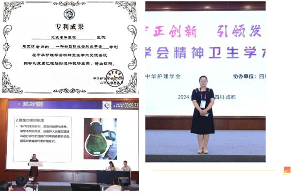 北京老年医院护理部马宗娟总护士长受邀在会场对已经成功进行专利转化的“一种新型防拔管手套”作专利成果汇报展示。她从专利设计思路及功能入手,介绍了该实用新型专利在保护患者管路、增加约束辨识度、促进患者舒适和便捷护理操作四方面的设计亮点,充分展示出我院护理人员的创新思路和优质护理服务风采。