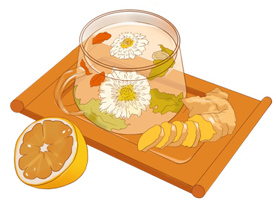 陈皮3克、生姜3片、茉莉花3克。开水冲泡,代茶饮用。每日3-5杯。