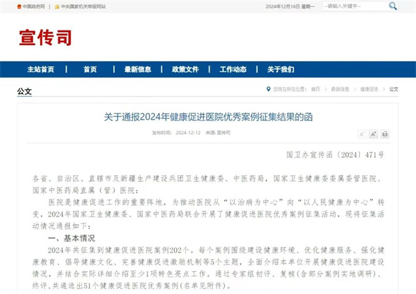 为有效贯彻健康中国战略,更好地维护患者、医务人员和公众健康,推动医院从以治病为中心向以人民健康为中心转变,国家卫生健康委、国家中医药管理局联合开展了2024年全国健康促进医院优秀案例征集活动。此次活动共面向全国各级医疗机构征集到健康促进医院案例202个,通过专家组对案例进行初评、复核(含部分案例实地调研)推选出78个进入终评,入选单位通过线上答辩,最终共遴选出51个健康促进医院优秀案例。