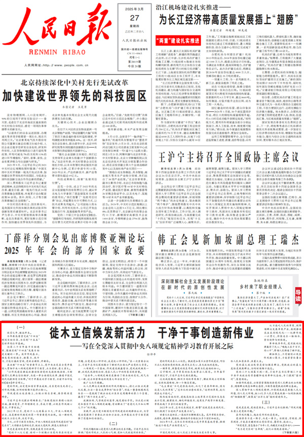 《人民日报》今日推出任仲平文章《徙木立信焕发新活力 干净干事创造新伟业——写在全党深入贯彻中央八项规定精神学习教育开展之际》。文章指出,中央八项规定是新时代制定的第一部重要党内法规。这一新时代的徙木立信之举,改变中国。而今迈步从头越。以八项规定催发更深层次的化学反应,以中国共产党之治引领中国之治,我们必将创造新的更大奇迹。