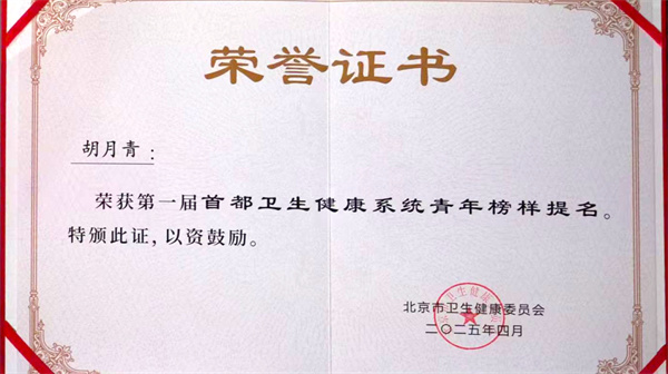 胡月青同志作为北京老年医院优秀青年代表,在专业能力、科研创新、学科建设、抗疫担当以及人文关怀等方面取得了显著成绩,展现了医者仁心与学术专精的双重风采。
