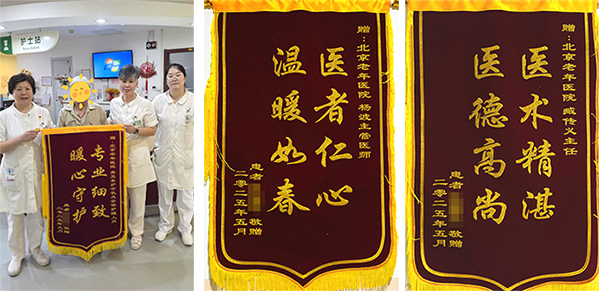 5月16日,北京老年医院特需病房内上演了感人一幕:一位踝关节开放伤患者及其家属,将 三面烫金锦旗 郑重交到医护人员手中,“专业细致,暖心守护”“医者仁心,温暖如春”“医术精湛,医德高尚” 的字样,在阳光下熠熠生辉,无声诉说着医患之间的深情厚谊。