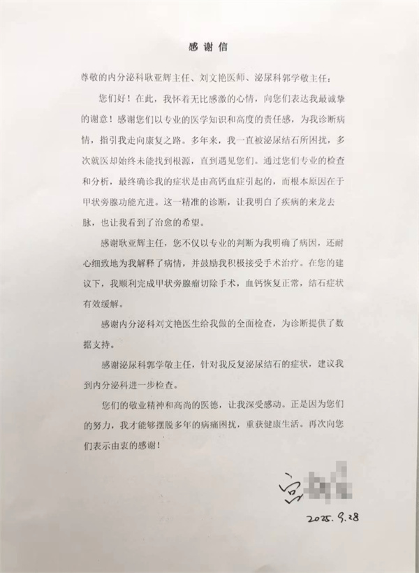 近日,我院内分泌科耿亚辉主任、刘文艳医师与泌尿外科郭学敬副主任医师收到了一封打印得工工整整,带有签名的感谢信。