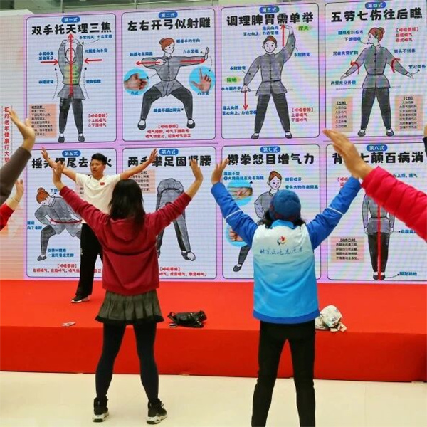 太极拳、八段锦教学人气高涨。现任北京市朝阳区酒仙桥街道办事处太极拳队教练兼领队的职业武术教练王文龙老师,手把手教授群众太极拳及八段锦的一招一式,纠正动作,细致讲解功法要领,现场几十余名老人跟随学习,逐步掌握适合日常锻炼的养生技能。