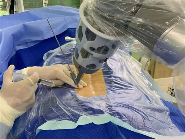 手术中,马建华主任团队在机器人实时导航引导下,仅在患者背部开一处约3毫米的微孔,精准避开脊髓、神经等重要结构,顺利抵达病变椎体,随后缓慢注入骨水泥进行强化固定。整个手术过程出血不足5毫升,耗时较传统手术缩短30%,更重要的是,机器人的精准定位将骨水泥渗漏风险明显降低,为高龄患者筑起了坚实的安全屏障。