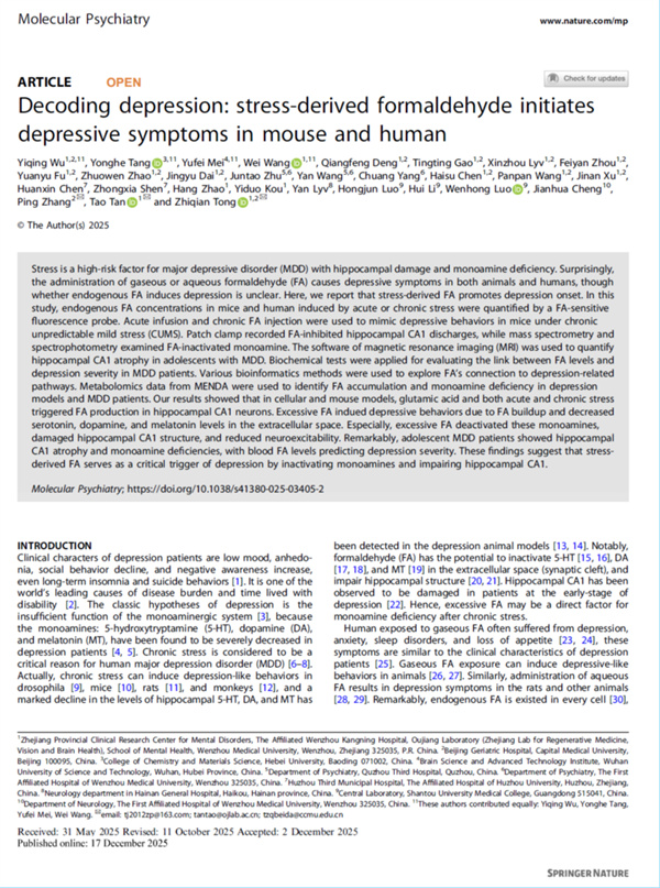2025年12月18日,童志前课题组联合我院放射科张平主任 在Nature子刊Molecular Psychiatry(精神领域顶刊,IF=10.1,JCR1区,中科院1区)发表题为《解码抑郁症:应激来源的甲醛诱发小鼠与人抑郁症状》的论文。