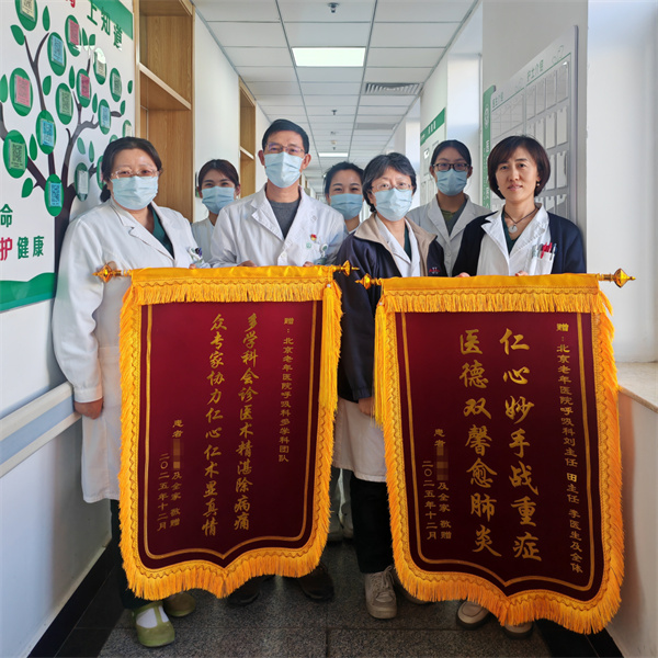 12月25日,北京老年医院呼吸内科病区内暖意融融,患者焦先生的家属将两面饱含深情的锦旗郑重送到医护人员手中,一面致谢呼吸内科团队的精准救治与悉心照料,一面感恩多学科团队的协同作战与鼎力支持,字里行间满是对医护人员的由衷感激与诚挚祝福,为寒冬增添了浓浓的医患温情。
