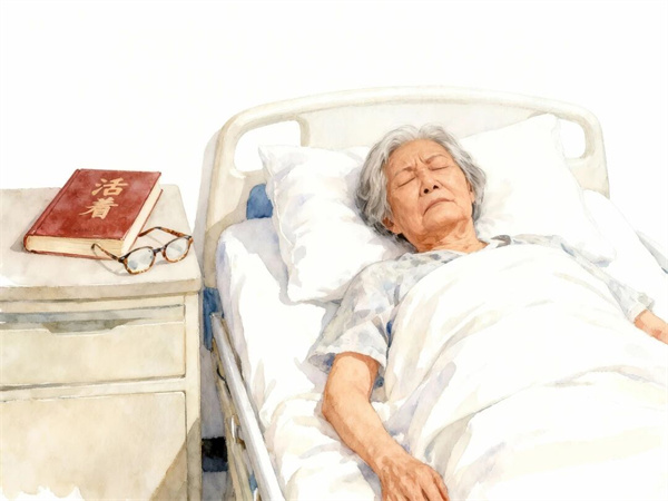 奶奶头发花白,正闭着眼睛假寐,眉头紧紧皱着,眉间的皱纹像要代替她诉说心事。旁边床头柜上放着一本崭新的书《活着》,里面夹着的书签还在最上层,旁边是一副镜腿已经掉漆的眼镜,似乎在诉说着它陪伴主人走过的漫长岁月。