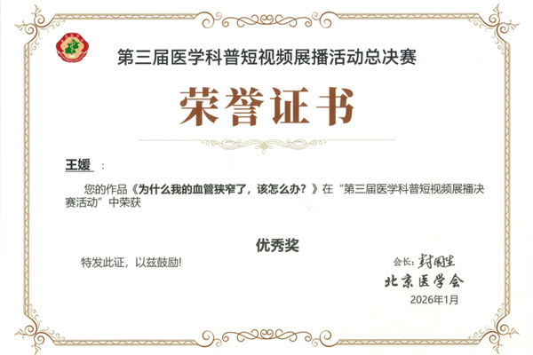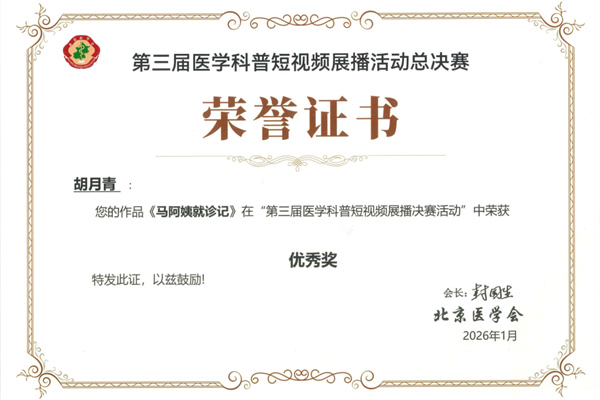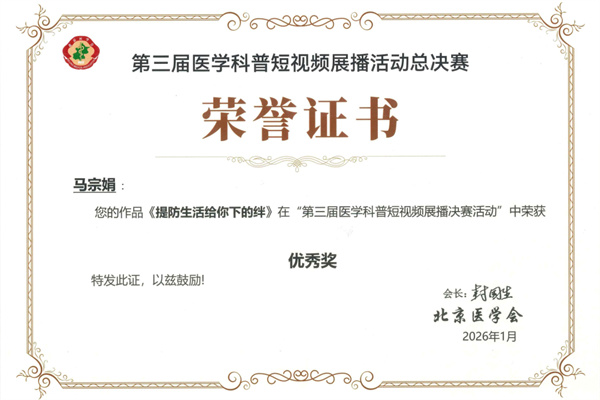 1月14日,由北京医学会主办的第三届医学科普短视频展播活动总决赛圆满收官,大赛旨在深入扎实推动北京健康卫生建设,充分发挥新媒体短视频作品在健康科普传播中的优势,进一步普及健康知识、增强全民健康意识、倡导健康生活方式、提高全民健康素养。在此次展播活动中我院7部作品获优秀奖。