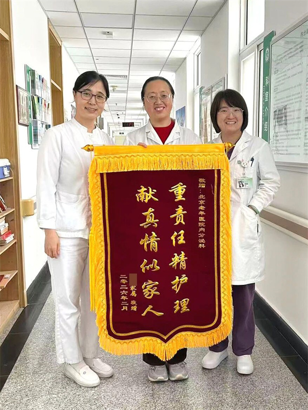 近日,87岁高龄的田爷爷专程来到北京老年医院,亲手将一面锦旗送到皮肤性病科汤恭锋主任、内分泌科耿亚辉主任及两科医护团队手中。锦旗上的暖意,既是对医护人员精湛医术的由衷赞誉,更是对医院多学科诊疗模式的高度肯定。