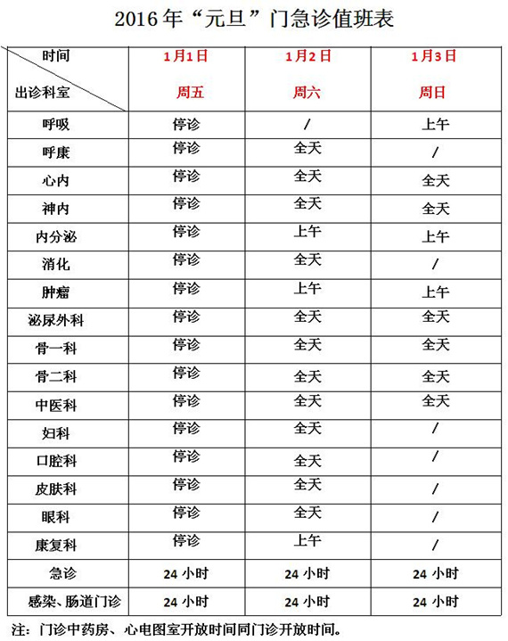 2016年元旦门急诊出诊安排