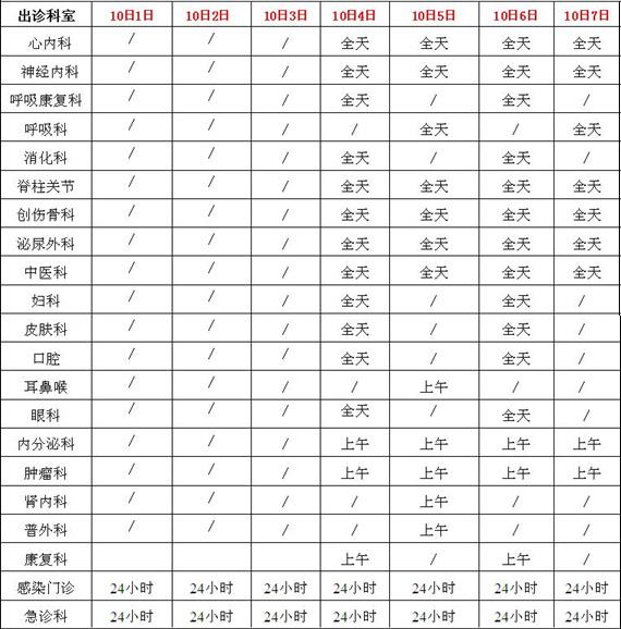 四、10月6日(出周六诊) 出诊科室有 :神经内科、心内科、呼吸康复科、消化科、泌尿外科、骨科1、骨科2、中医科、口腔科、眼科、妇科、皮肤科全天门诊。内分泌科、肿瘤科、康复科上午门诊。