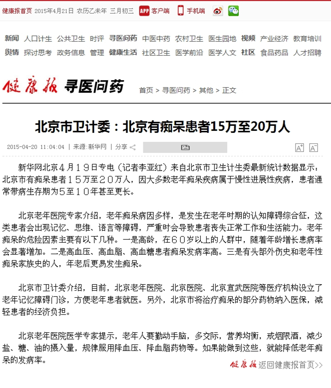 下一篇: [央广网] 北京市痴呆患者约15-20万 多种措施防治老年性痴呆